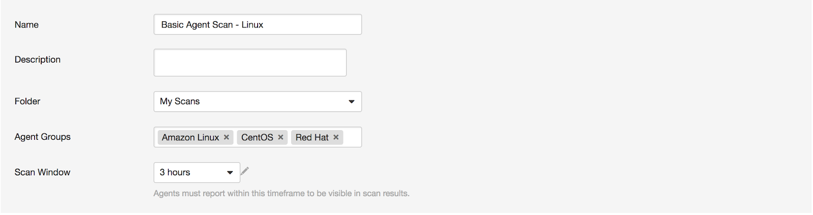 In this example, a scan is created based on the Basic Agent Scan template, and is assigned the group Amazon Linux, CentOS, and Red Hat. This scan only scans these assets.