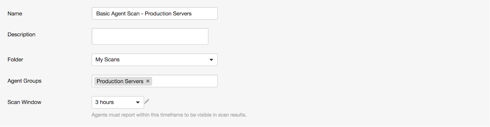In this example, a scan is created a scan based on the Basic Agent Scan template, and is assigned the group Production Servers. This scan only scans production server assets.