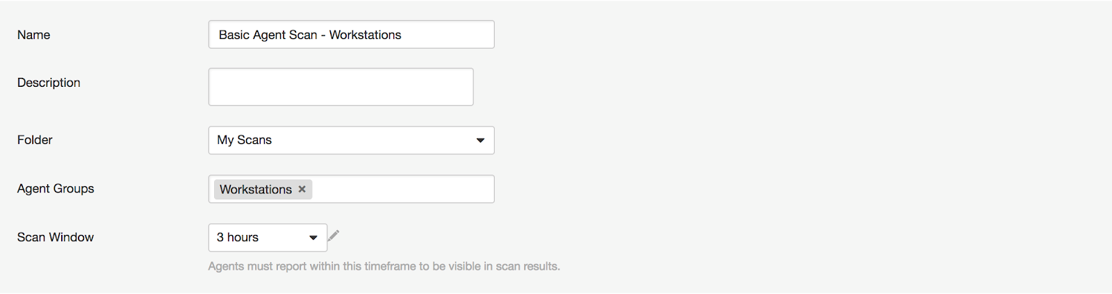 In this example, a scan is created based on the Basic Agent Scan template, and is assigned the group Workstations. This scan only scans workstation assets.