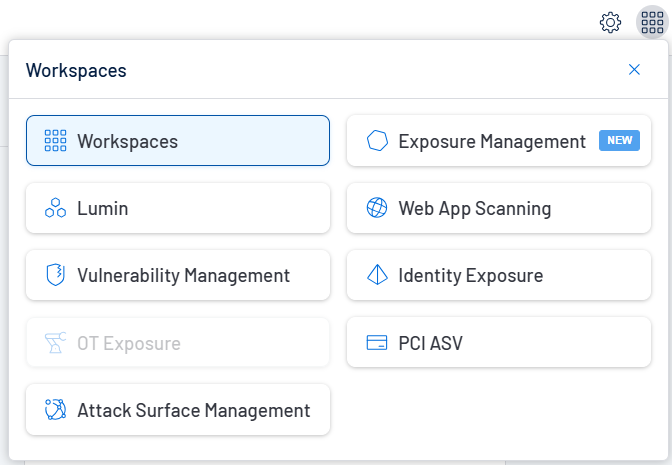 When you log in to Tenable, the Workspace page appears by default. On the Workspace page, you can switch between your Tenable applications or set a default application to skip the Workspace page in the future. You can also switch between your applications from the Workspace menu, which appears in the top navigation bar.