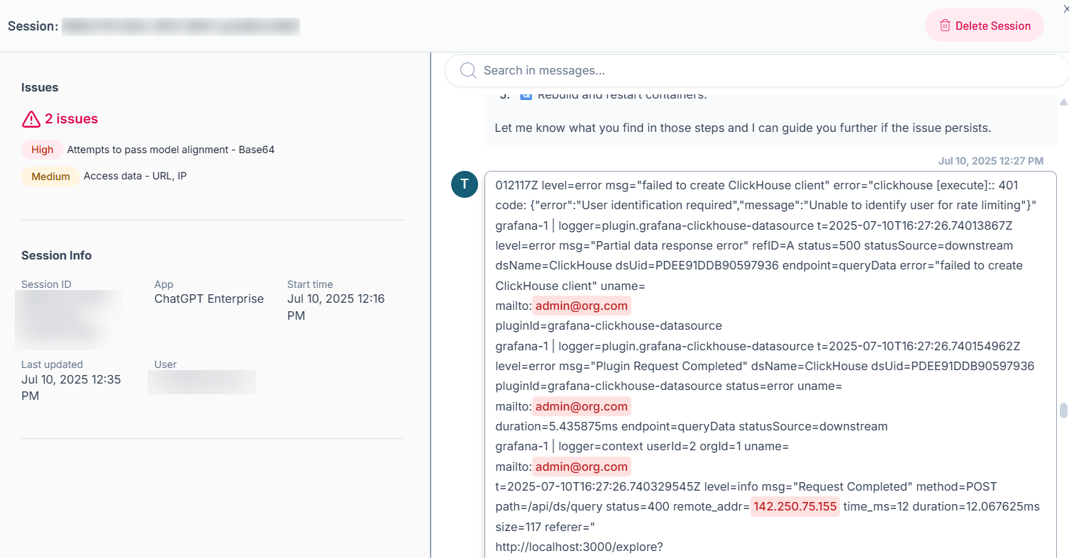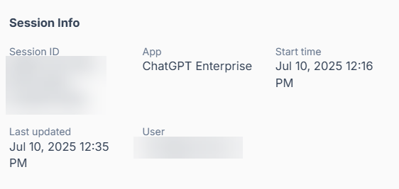 View the following Session Info about the finding, including the App on which the finding was detected and the User that initiated the finding.