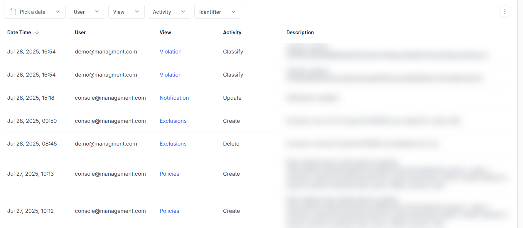 Description — A brief description of the action taken by the user, for example, Rule deleted.