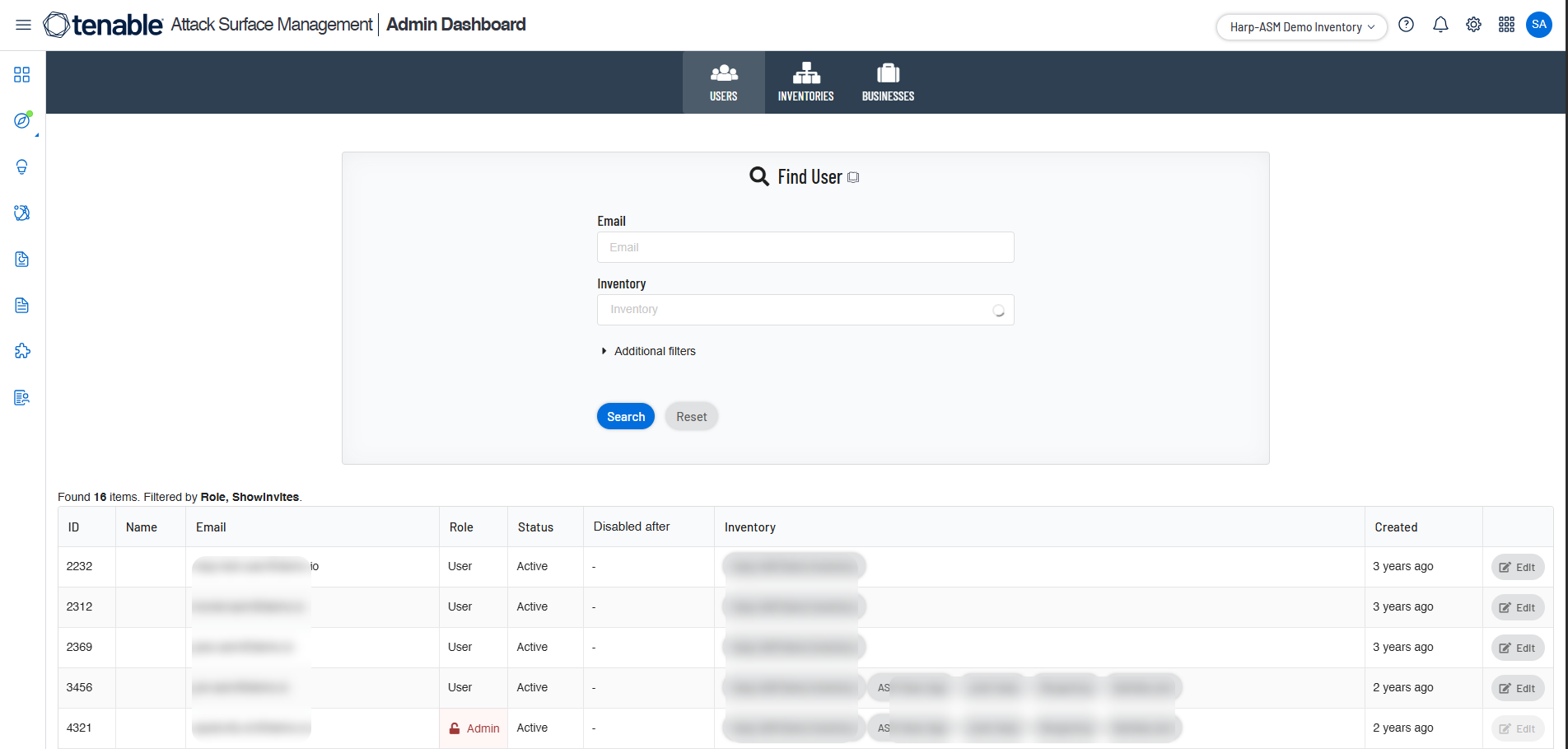 User accounts with a Business Admin role can access the Tenable Attack Surface Management administrator interface to manage users, inventories, and business settings.