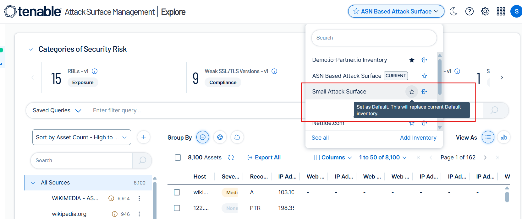 Tenable Attack Surface Management displays the inventories in the drop-down list.