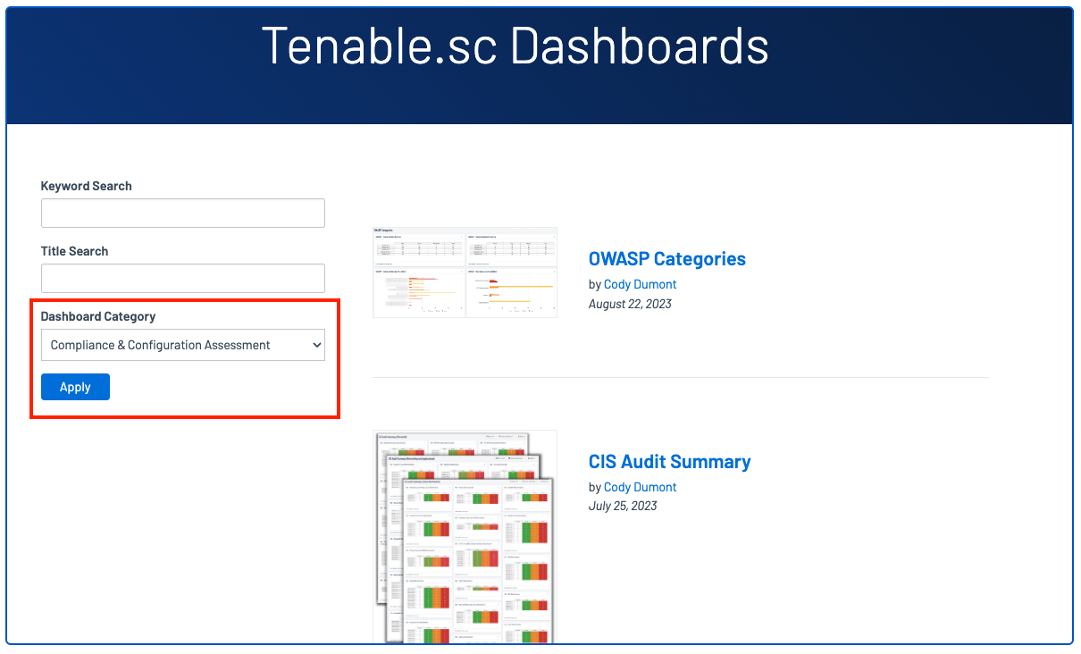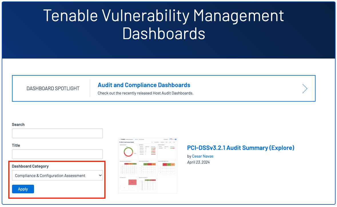 Detailed information on all the available Compliance dashboards can be found online by referencing these locations for Tenable Security Center and Tenable Vulnerability Management. For each select the Compliance and Configuration Assessment Category to list the available content and references.