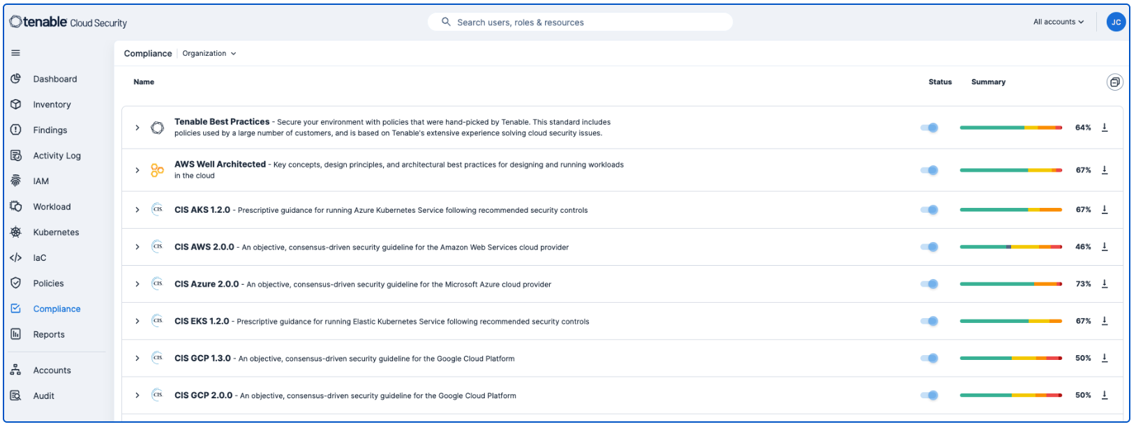 Protecting cloud environments is vital for protecting data, ensuring compliance with regulatory requirements, maintaining operational continuity, managing risks, and optimising business efficiency. Tenable Cloud Security provides out-of-the-box, continuously updated support for all major compliance frameworks, and best practices. Tenable Cloud Security provides the ability to create customised frameworks to meet the exact needs of your organisation. Using customised reports, communicate with stakeholders on internal compliance, external audit and daily security activities.