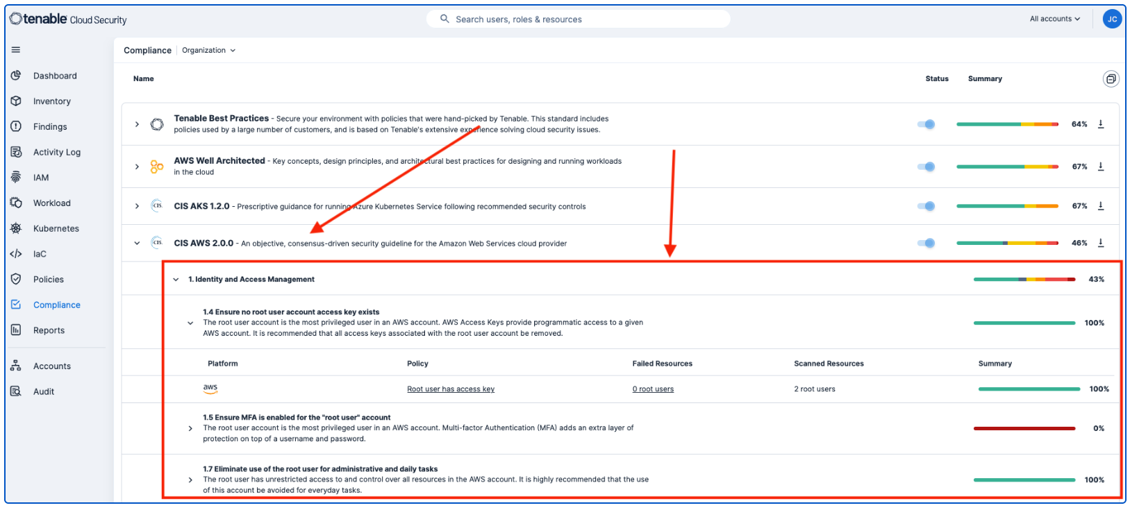 To view details, analysts can drill down into any of the findings. In this example, drilling down into the CIS AWS 2.0.0 item provides details on the root account.