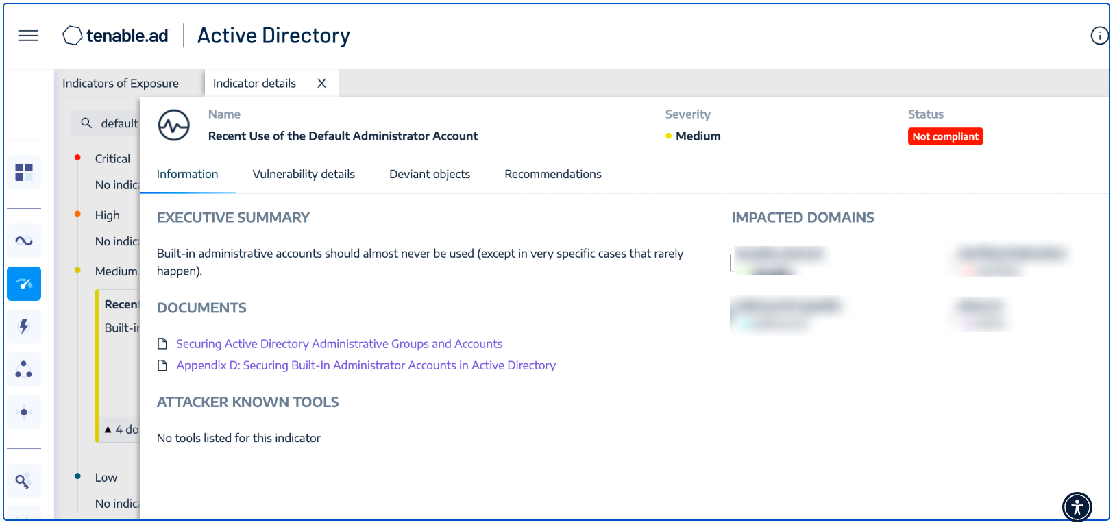In addition, Tenable Identity Exposure provides the ability to determine if a default administrator account was recently used in the environment, as shown in the image below:
