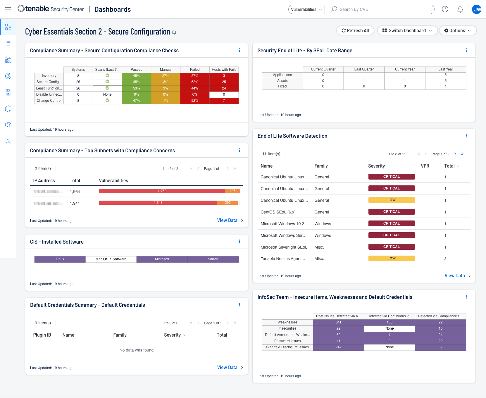 Tenable has provided a Cyber Essentials Dashboard and Report for Tenable Security Center and Tenable Vulnerability Management for this Key Component. Those dashboards and reports can be found here by using the term “Cyber Essentials” as a search query: