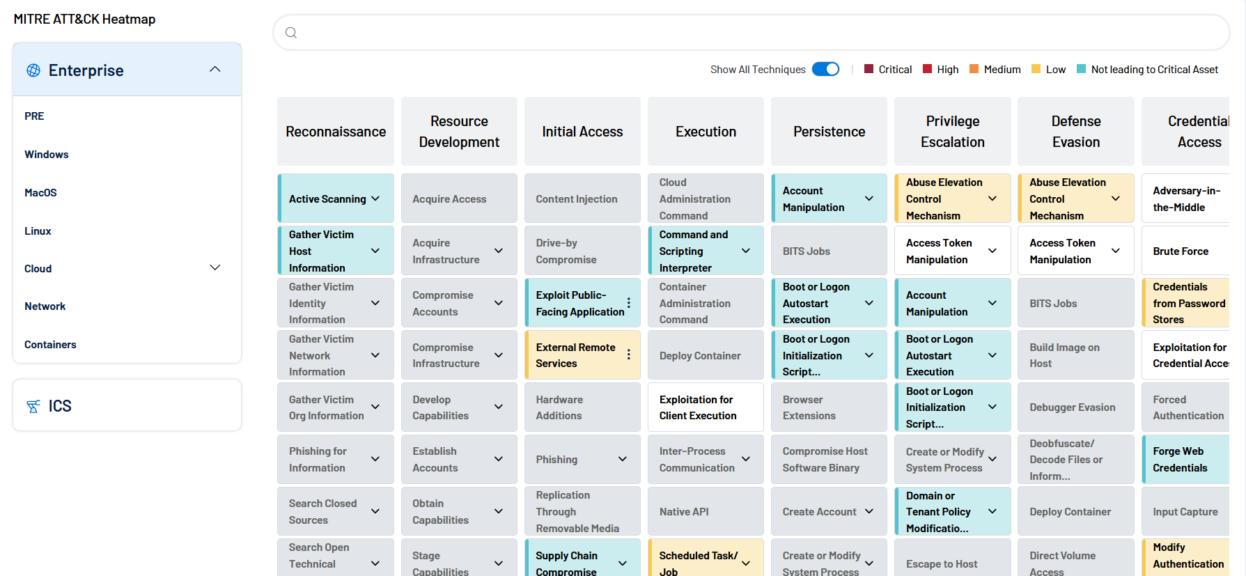 Click the Show All Techniques toggle to view only the cells that are color-coded by severity. This hides the white and gray cells in the heatmap table and shows only the techniques relevant to your organization.