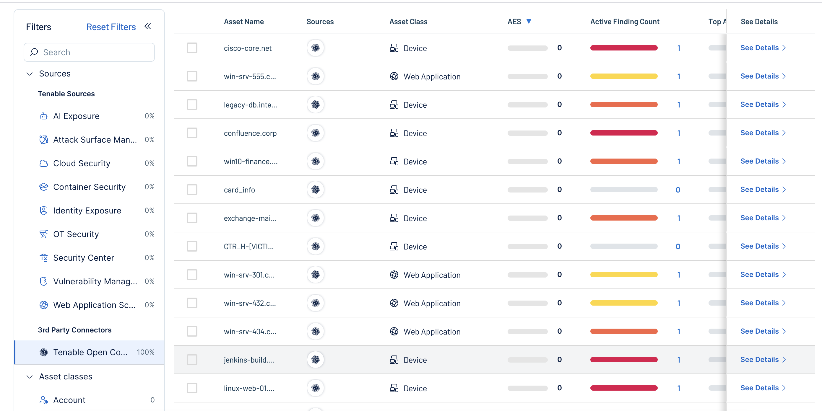 - Validate the import: Filter your Assets view by Source > Custom > Tenable Open Connector to ensure findings appear on the correct assets.
