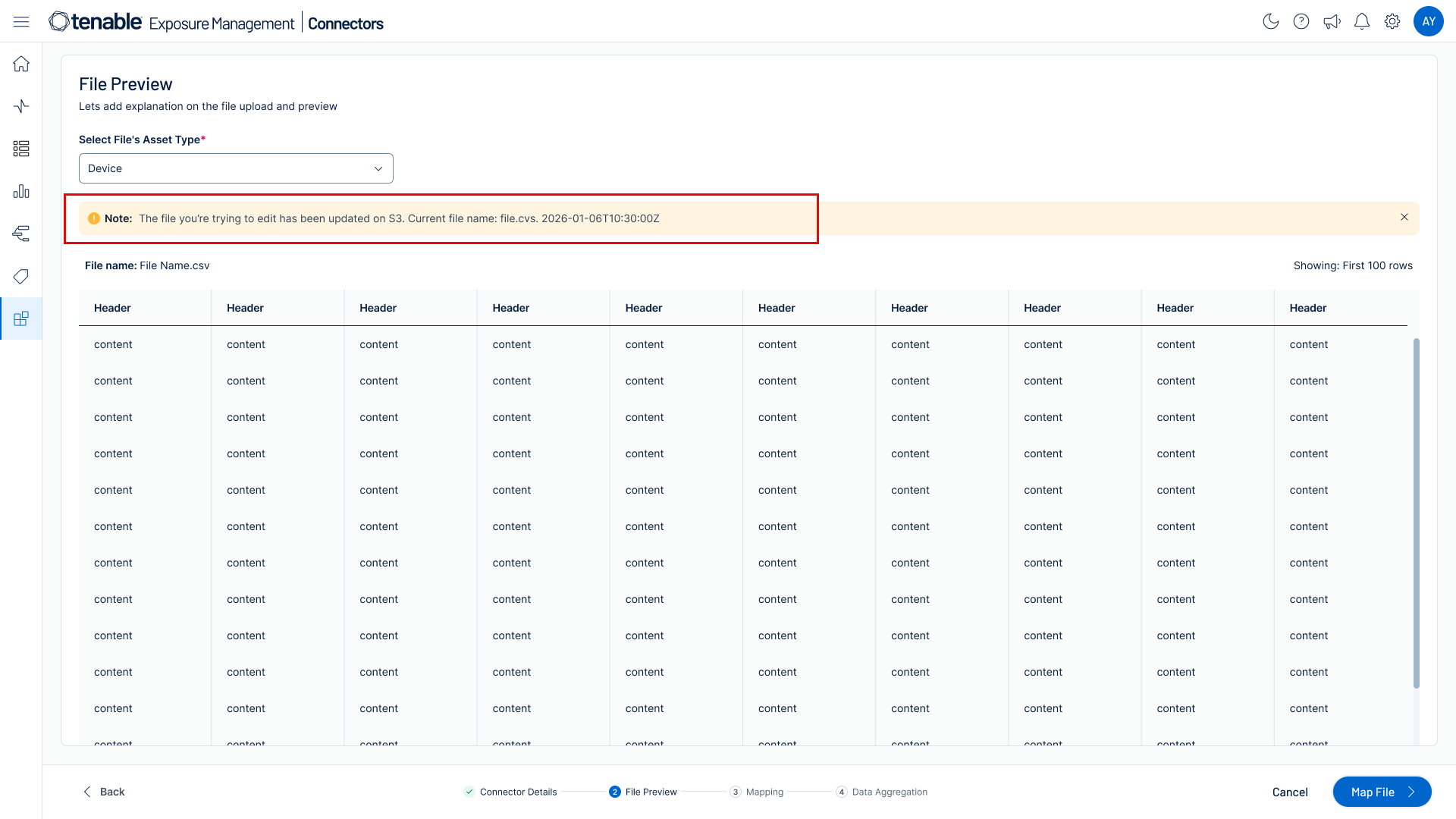 TIP: To learn about the expected behavior and logic rules of how Tenable Exposure Management maps the source file columns, see Tenable One Open Connector Mapping . -