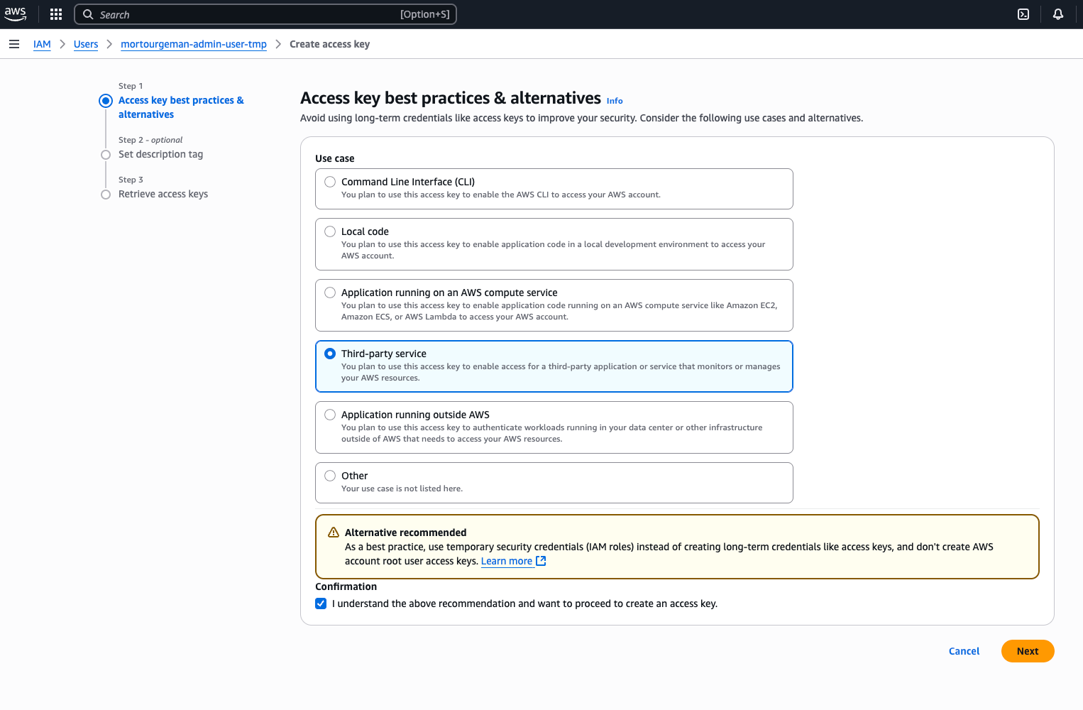 In the Access key best practices and alternatives, select Third-party service as the use case.