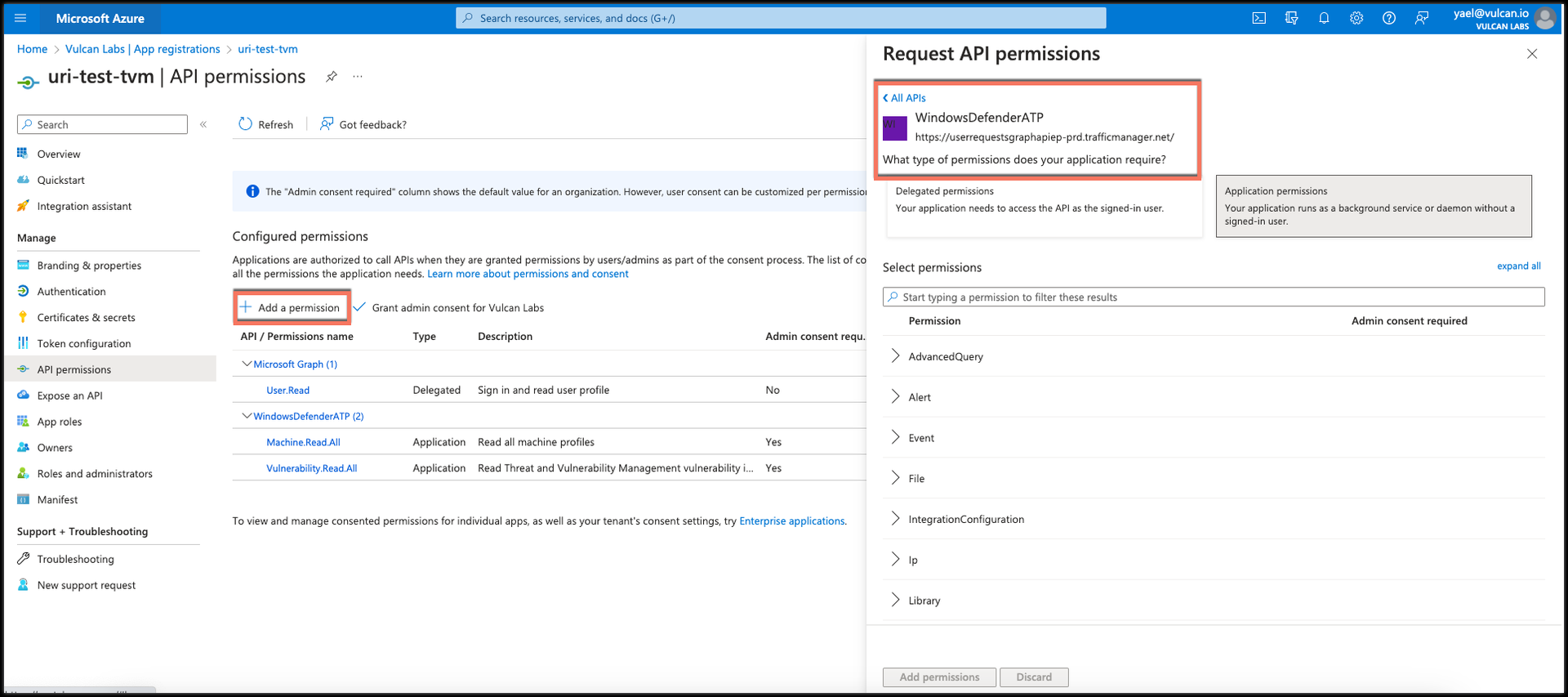 Register a Microsoft TVM application, generate Client and Tenant ID, and grant the required access permissions: