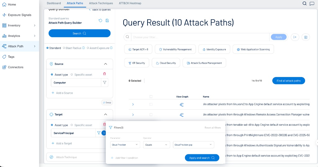 Once Tenable Exposure Management correlates the data, you can locate these specific hybrid paths using the Attack Path Query Builder.