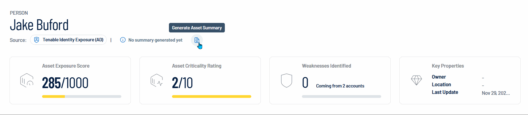 Tenable Identity Exposure allows you to generate a summary of an identity using AI. Summaries are generated at the container level, and only apply to licensed identities within your container.