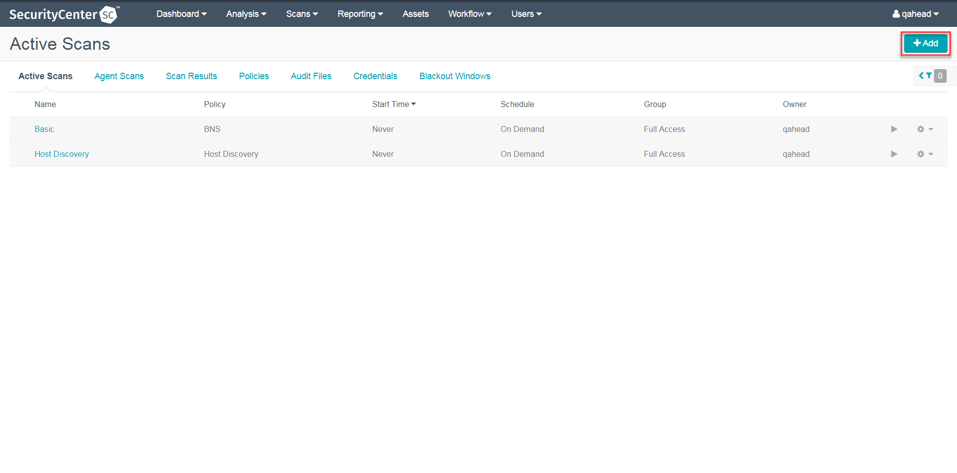 In the top navigation bar in Tenable Security Center, click Scans.