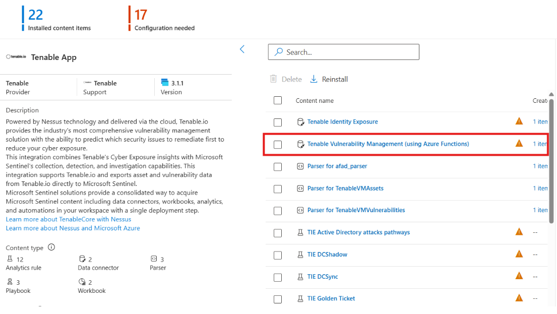 After clicking on the Manage button from the content hub in the Microsoft Azure portal, you get a list of Tenable Vulnerability Management Data Connectors in the solution.
