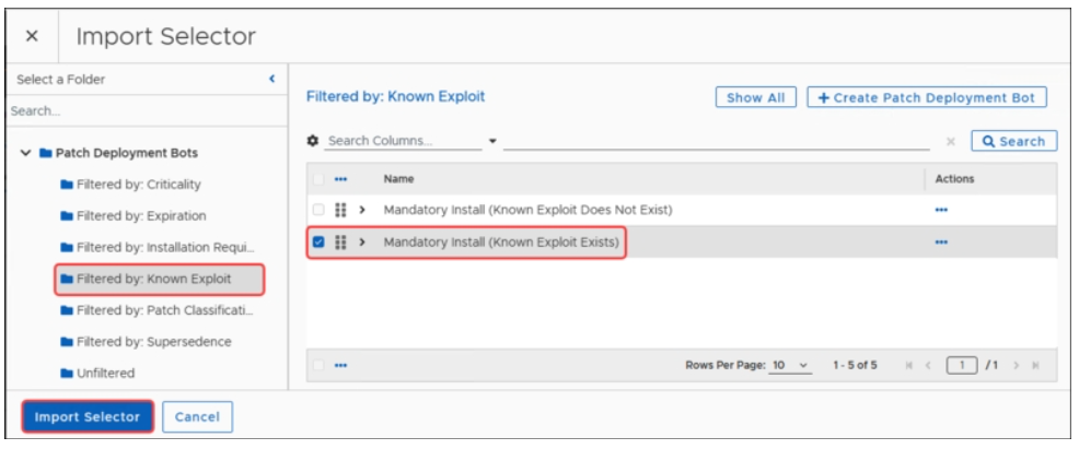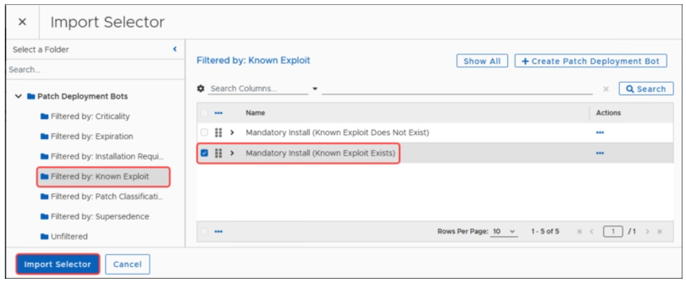 Select +Import Selector in the Patch Filter Settings dialog of an open Bot template (as detailed in the Open and Save a Patch Deployment Bot Template section earlier).