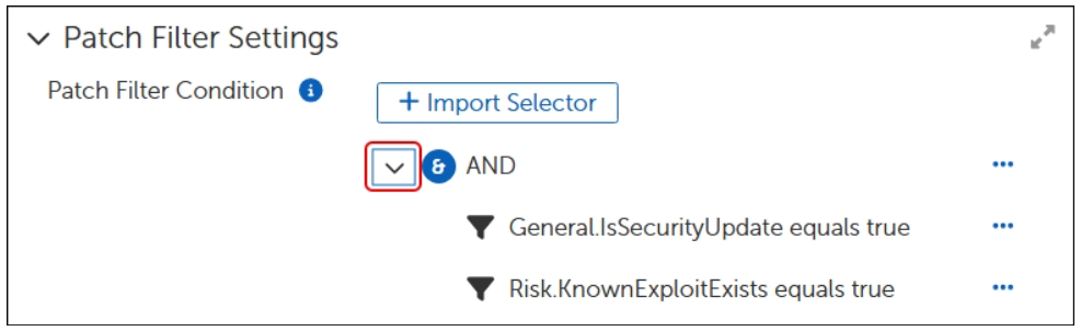 Select Import Selector at the lower left of the dialog. This returns you to the Patch Filter Settings where the condition logic now displays as Risk.KnownExploitExists Equals true.