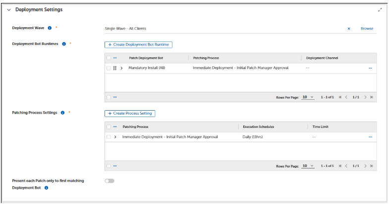Use the default Deployment Bot Runtimes and Patching Process Settings.