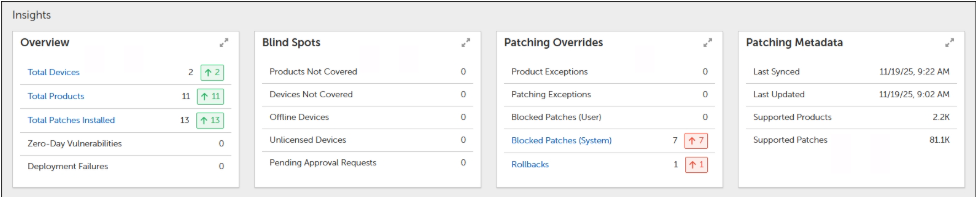 Patching Metadata - Summarizes the status of the latest endpoint scans and client product inventory updates. Metadata includes details about the products, patches, and updates approved for installation.