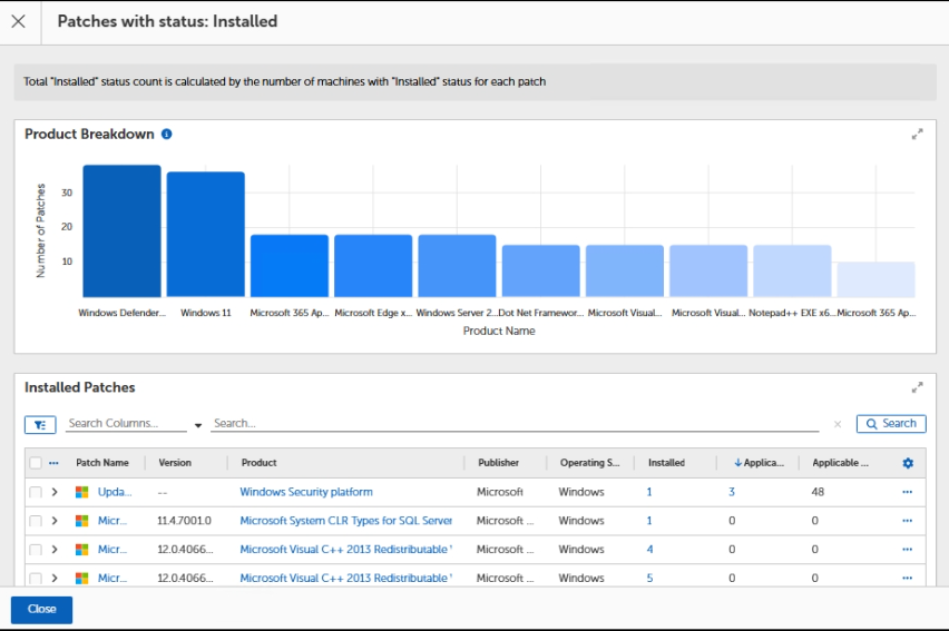 Status - The status of the Patch may change dynamically as new statues are updated and is reflected in the chart in real-time, and the graph over time. Some statues present in the graph may not actively appear in the real-time chart data. You can also click on each bar of the bar graph to open a fly-out and view those associated patches.
