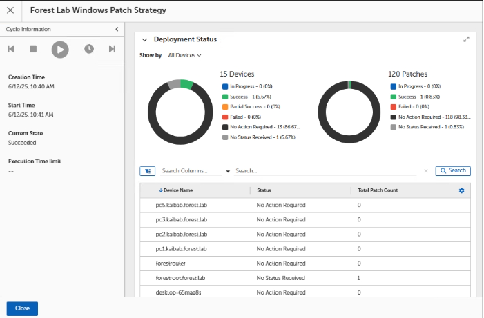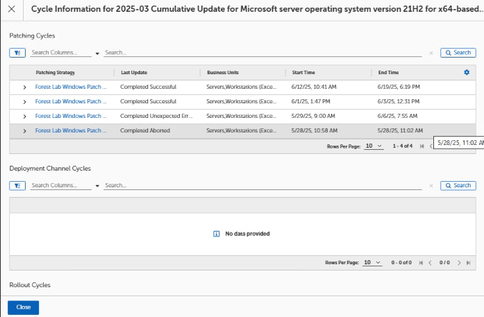 Patch Deployments - Lists either In-Progress and Completed individual patches that have been deployed. If you click on the number of Cycles, you can see the deployment cycle information for that patch. You can then click on these cycles which opens up the flex controls for this patching strategy cycle.