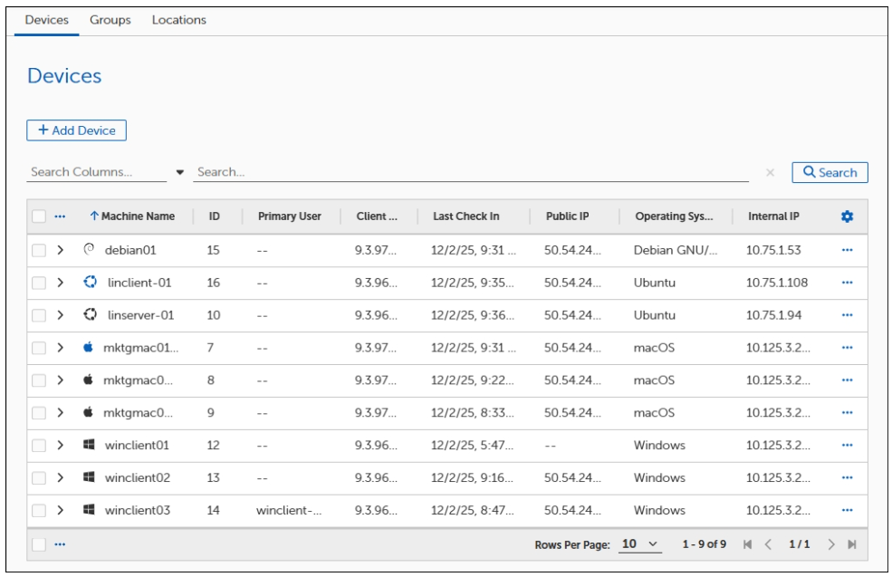 This displays a table of all clients reporting into the server. You can view each device's full information by clicking the > dropdown.