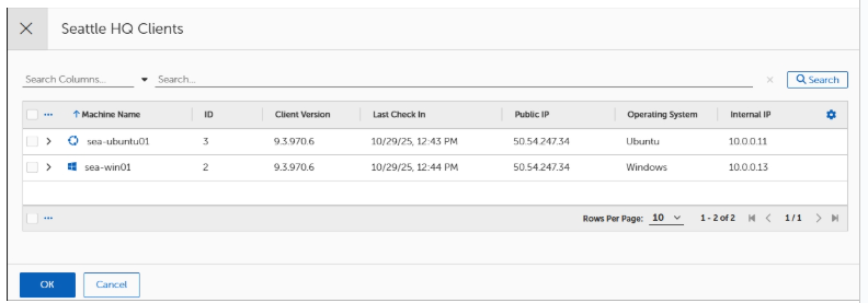 View Clients: Click the name of any Location from the Locations table to view their associated Clients. The Device overlay will open showing the list of machine names associated with the Location. The devices can be sorted by clicking the column headers (the Last Logged In and Public IP columns are not sortable). One important reason to view the device list is to determine which client is functioning as the RVP on a given subnet.