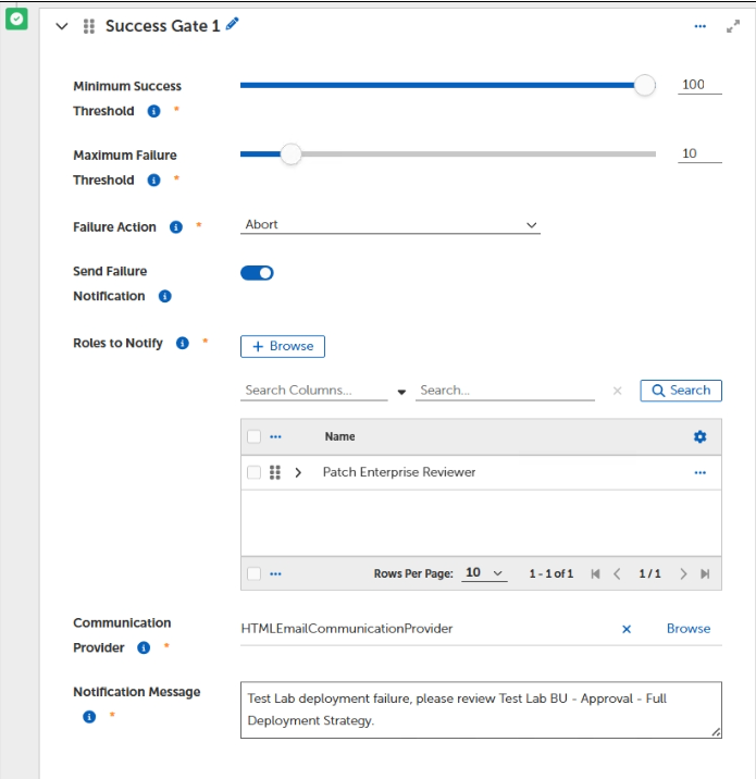 A Minimum Success Threshold sets how many deployments must succeed by percentage of devices before continuing. For example, if you have 2 devices and you set Minimum Success Threshold to 50%, at least 1 device must be successful before continuing the Patching Process pipeline.