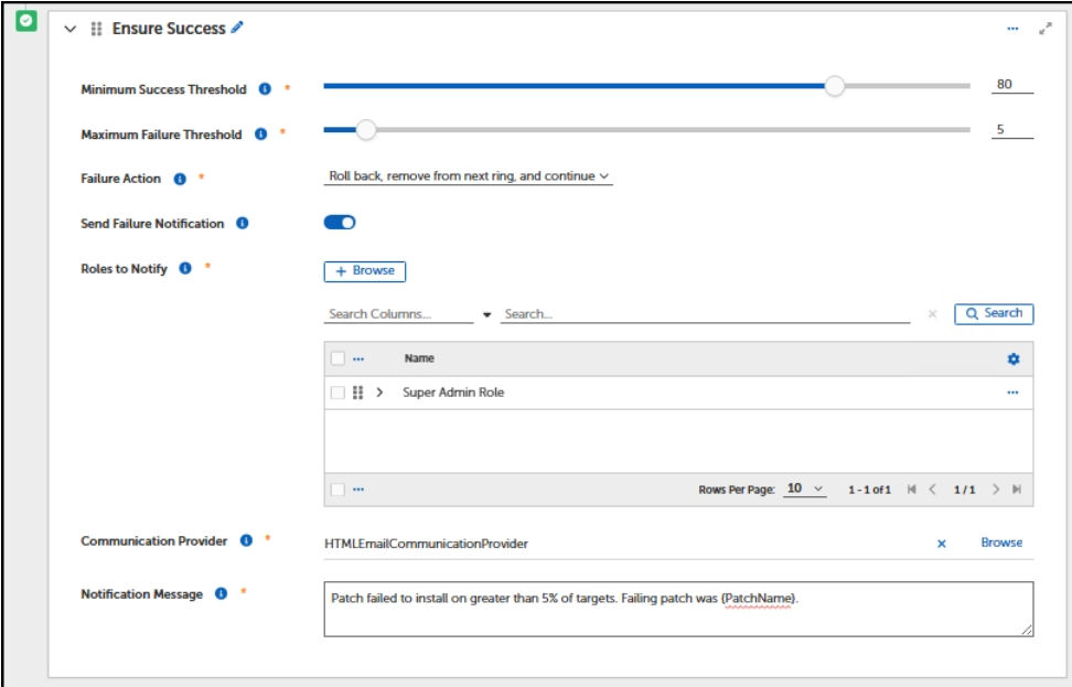 Similar to Minimum Success Threshold, you can set a Maximum Failure Threshold that will fail a Patching Process if the percentage of unsuccessful deployments is exceeded. In the same scenario of 2 devices, if you set the maximum to 50% and 1 device failed, it will trigger the Failure Action.