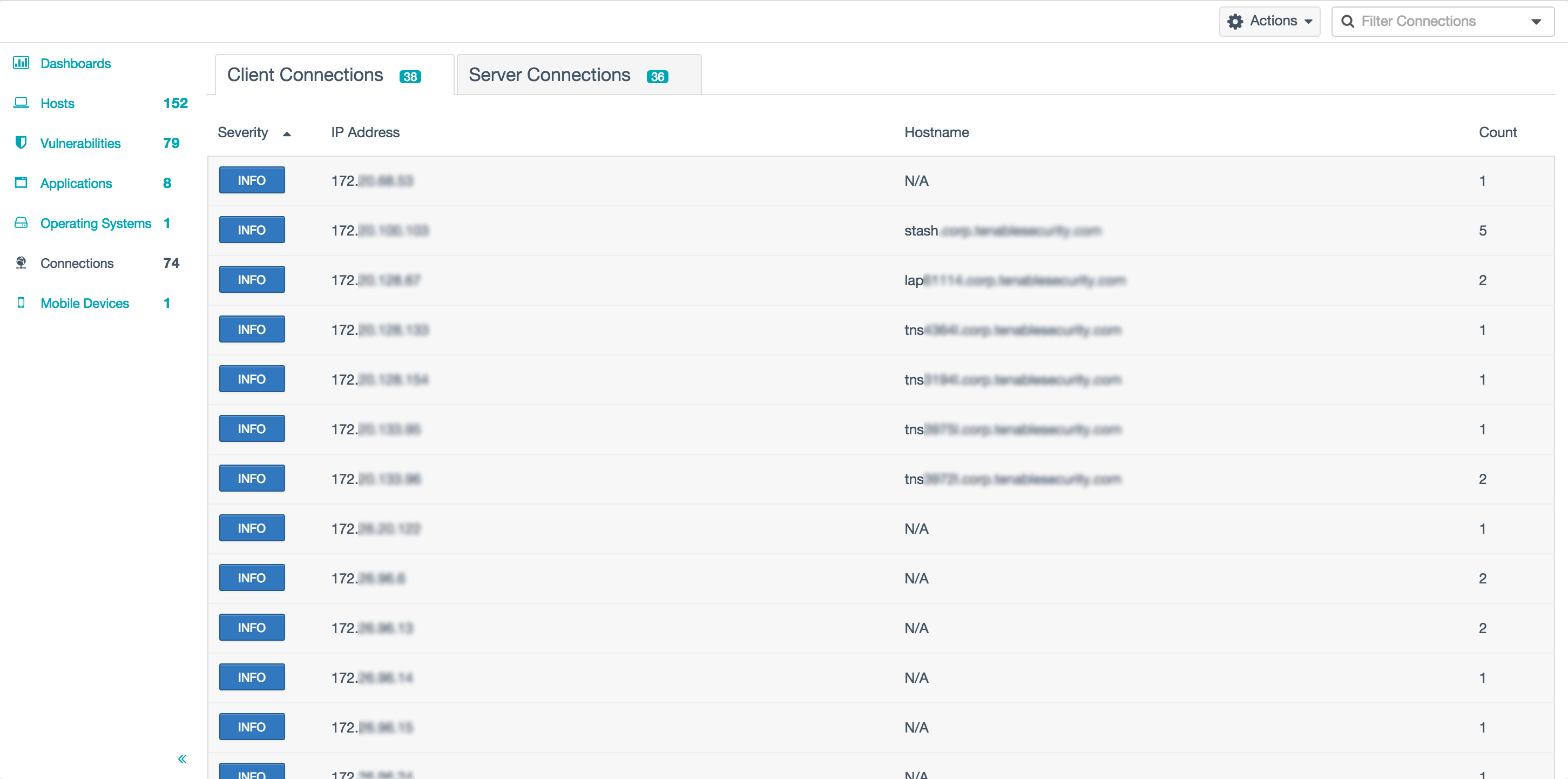 • The Server Connections tab displays a list of hosts. Click on a host to display connections to the selected host from other hosts, the port(s) used, and, if known, the services. Additionally, the Connections sidebar displays Host Details, a Server Connections diagram, and, where applicable, a Recent Sessions table.