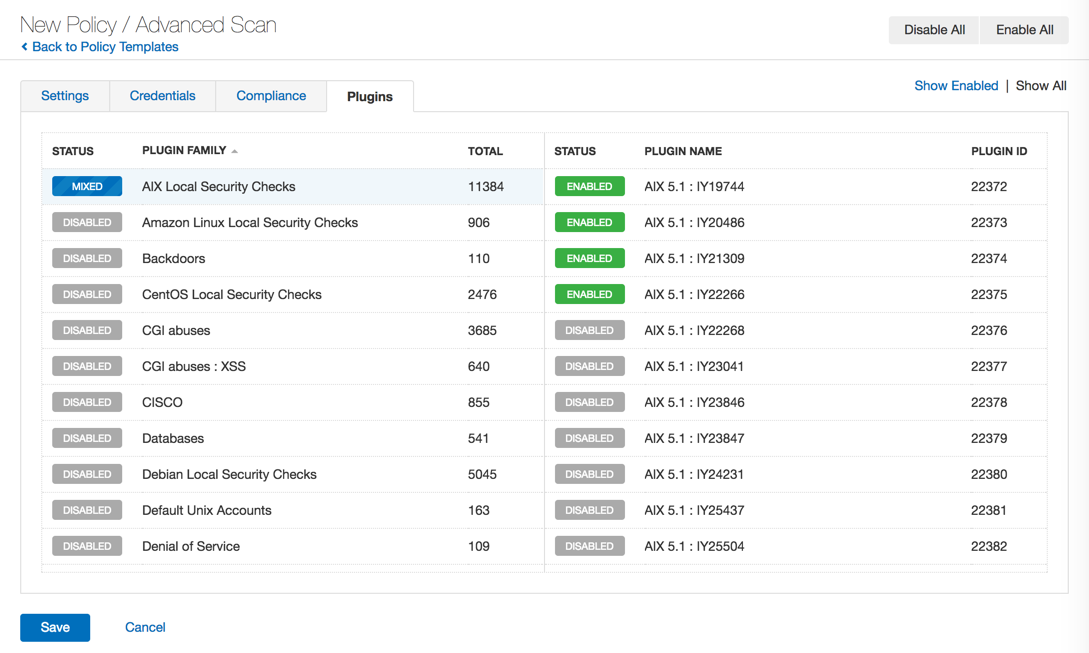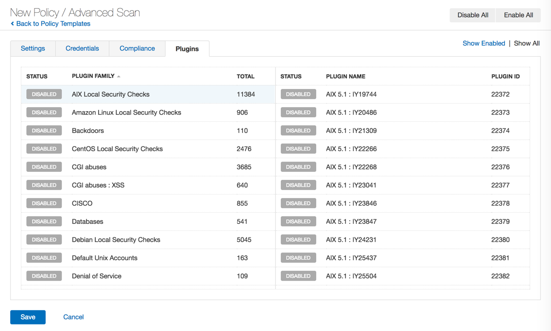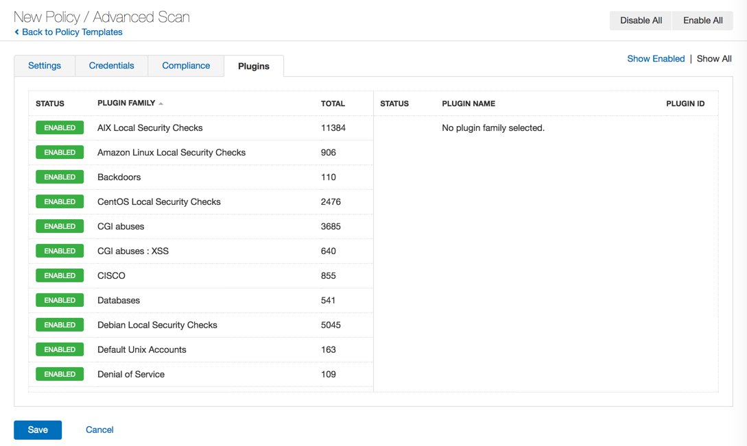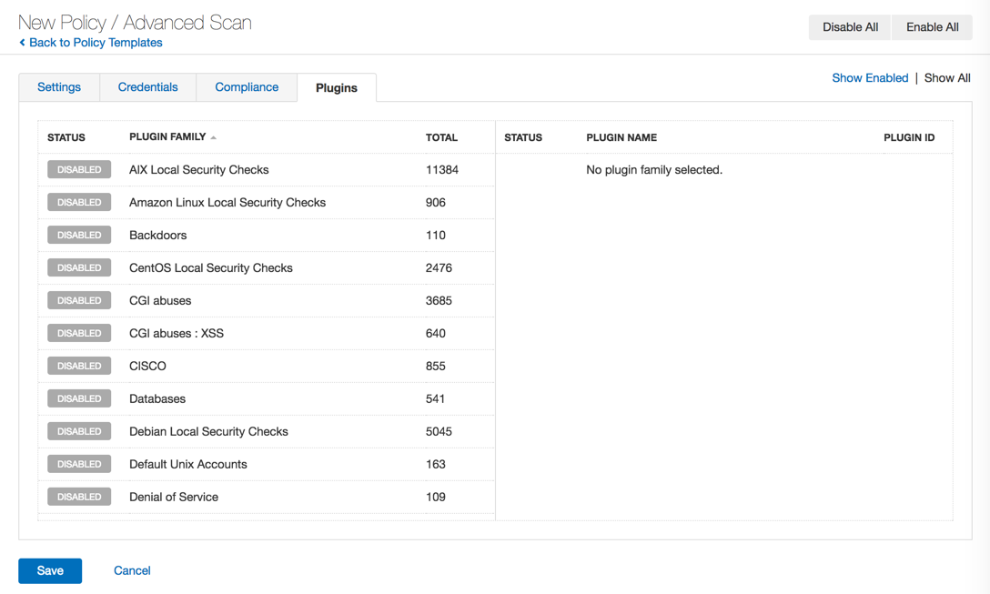 Tip: To enable or disable all plugins quickly, click the Enable All and Disable All buttons in the upper right corner. If you only need to enable one or a few individual plugins, Tenable recommends disabling all plugins. Then, you can select individual plugins as described in step 8. -
