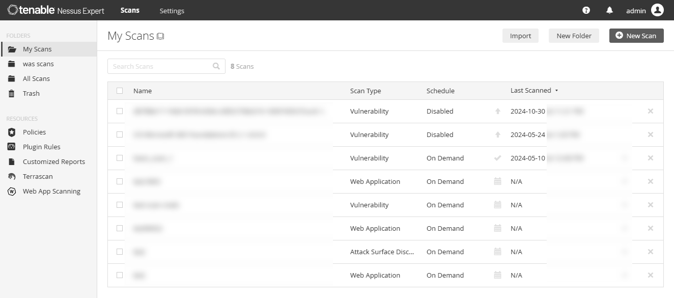 On the Scans page, you can create, view, and manage scans and resources. To access the Scans page, in the top navigation bar, click Scans. The left navigation bar shows the Folders and Resources sections.