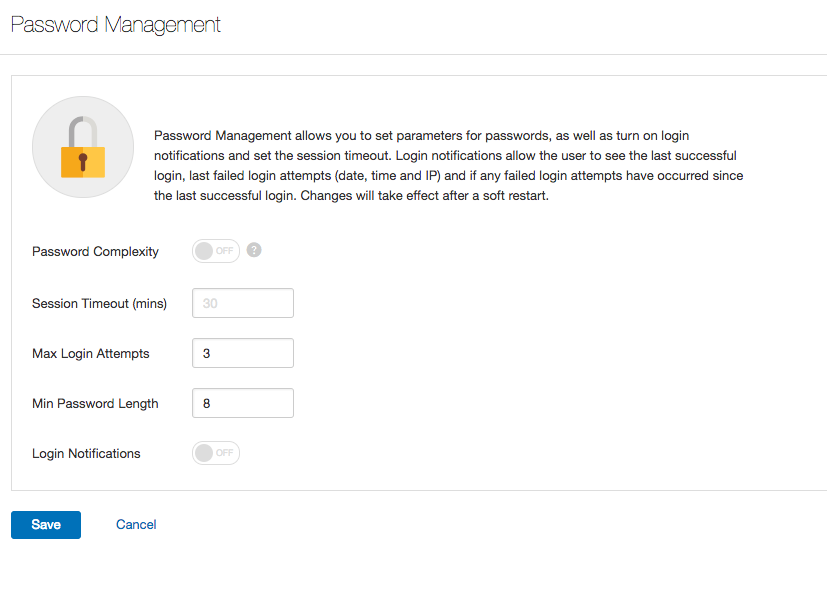 Note: Changes to the Session Timeout and Max Login Attempts settings require a restart to take effect.