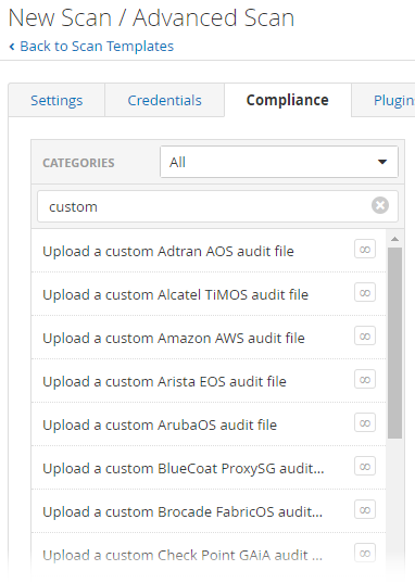 When you configure the Compliance settings of a Nessus scan, you can upload the following custom audit files: