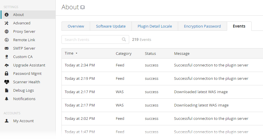 You can use the Events tab to view feed and web app scanning (WAS) events, such as when Tenable Nessus successfully connects to the plugin server, when Tenable Nessus begins and finishes plugin downloads, and when Tenable Nessus downloads the latest WAS image.