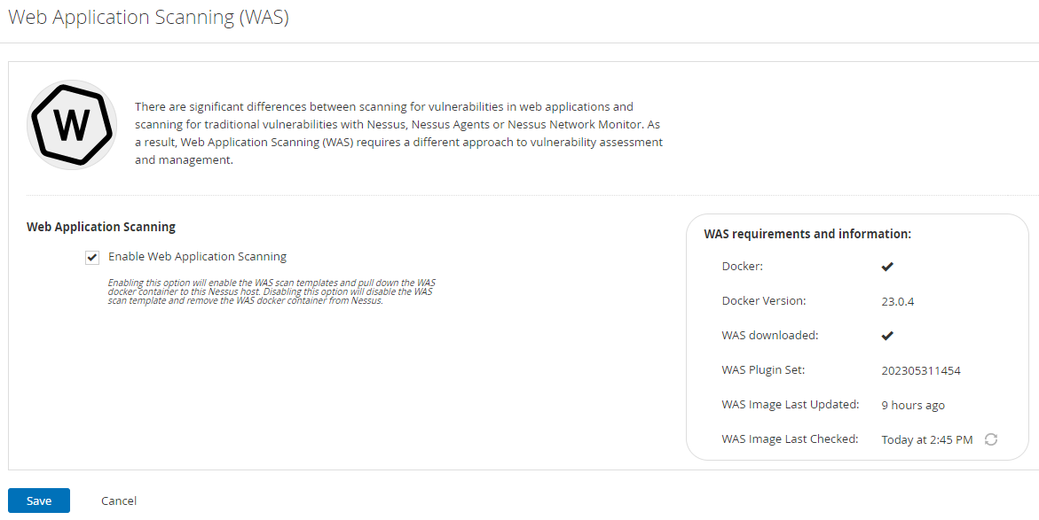 next to the WAS Image Last Checked field to update Tenable Nessus with the latest Tenable Web App Scanning version.For more information on how to install Tenable Nessus Expert and web application scanning, see the following video: Web App Scanning in Nessus Expert 10.6.