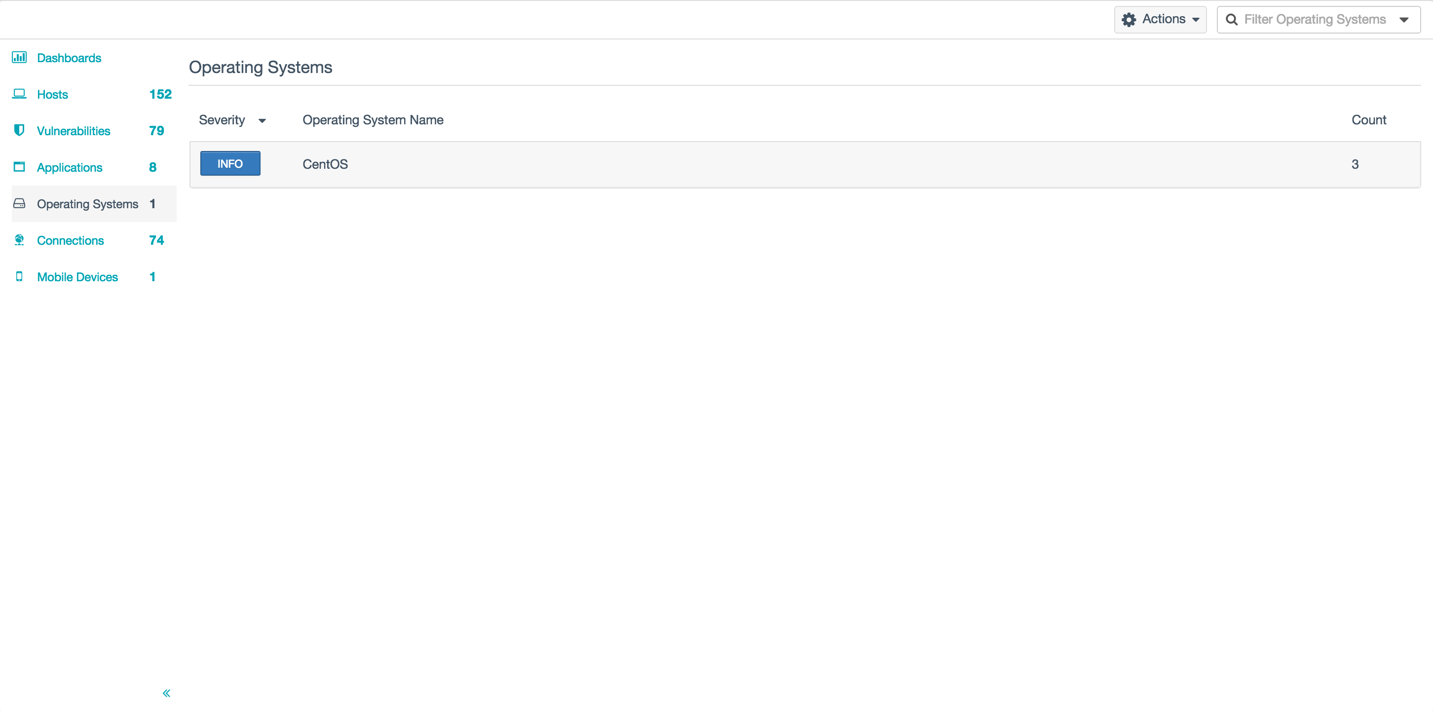 The Operating Systems section displays a list of discovered operating systems. This section lists the severity, operating system name as detected, and the number of discoveries.