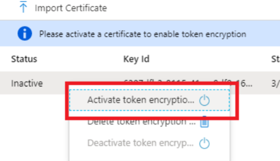 Right-click the newly uploaded certificate and click Activate Token Encryption.