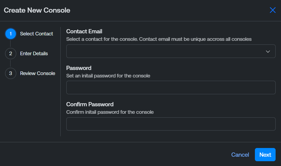 From the Contact Email drop-down, select the email address of the primary contact for the console.
