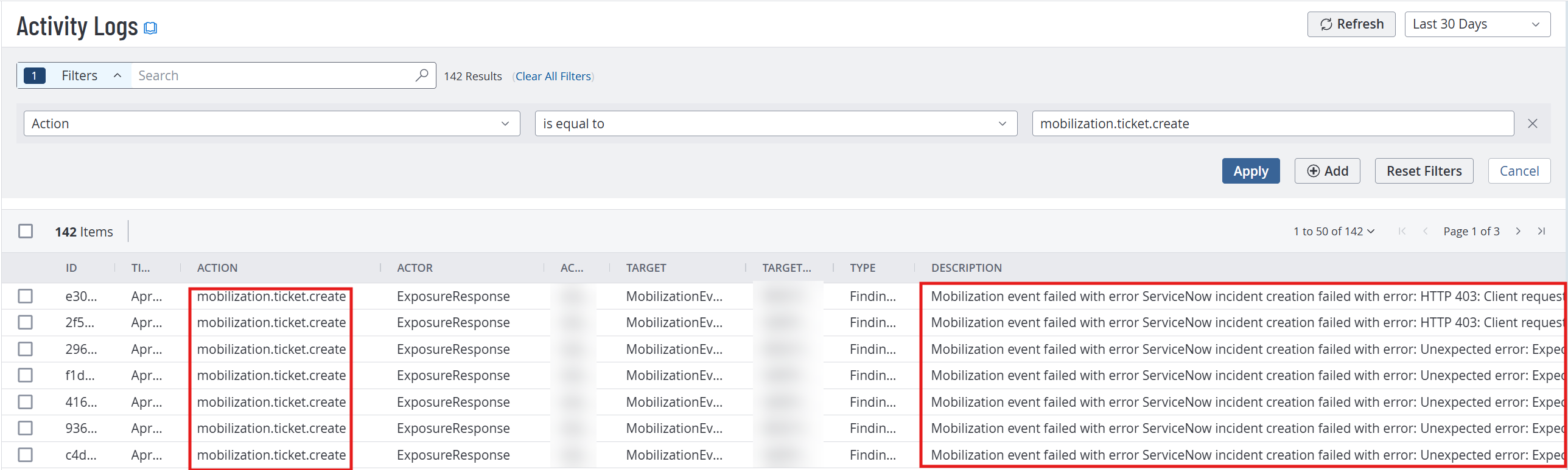 Tenable recommends regularly monitoring the Activity Logs. These logs provide real-time visibility into the status and execution of your third-party ticketing integration configurations, allowing you to verify successful data synchronization and quickly identify any communication failures between platforms.