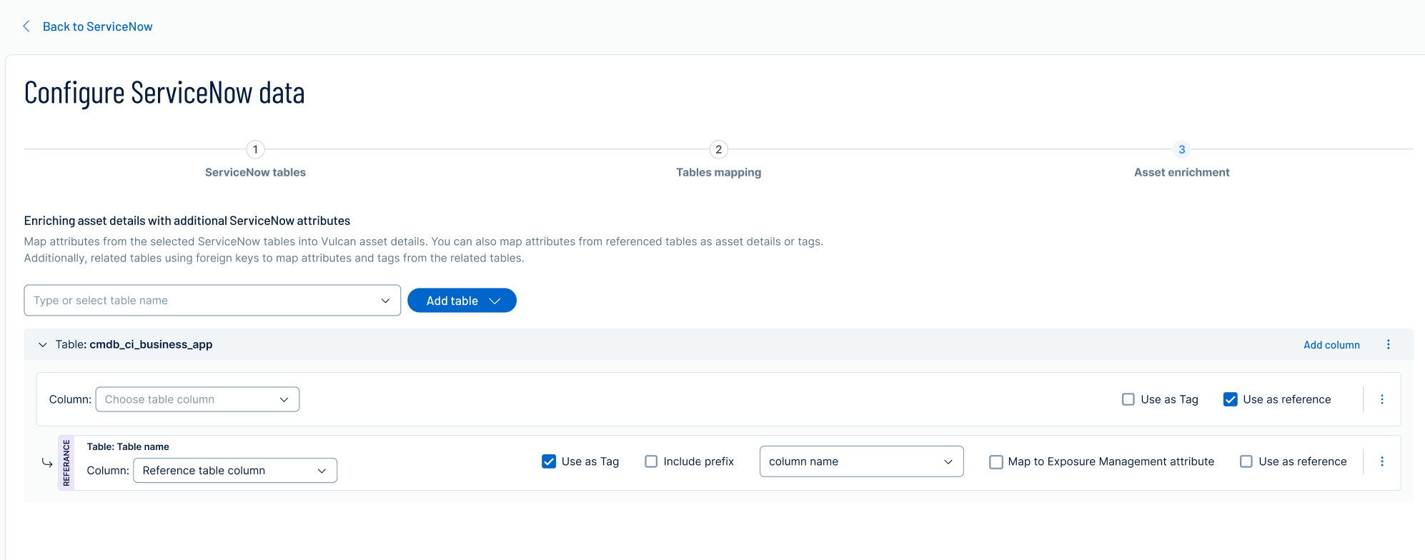When configuring the ServiceNow third party connector, you can now configure Asset Enrichment options to enrich asset details with ServiceNow attributes.
