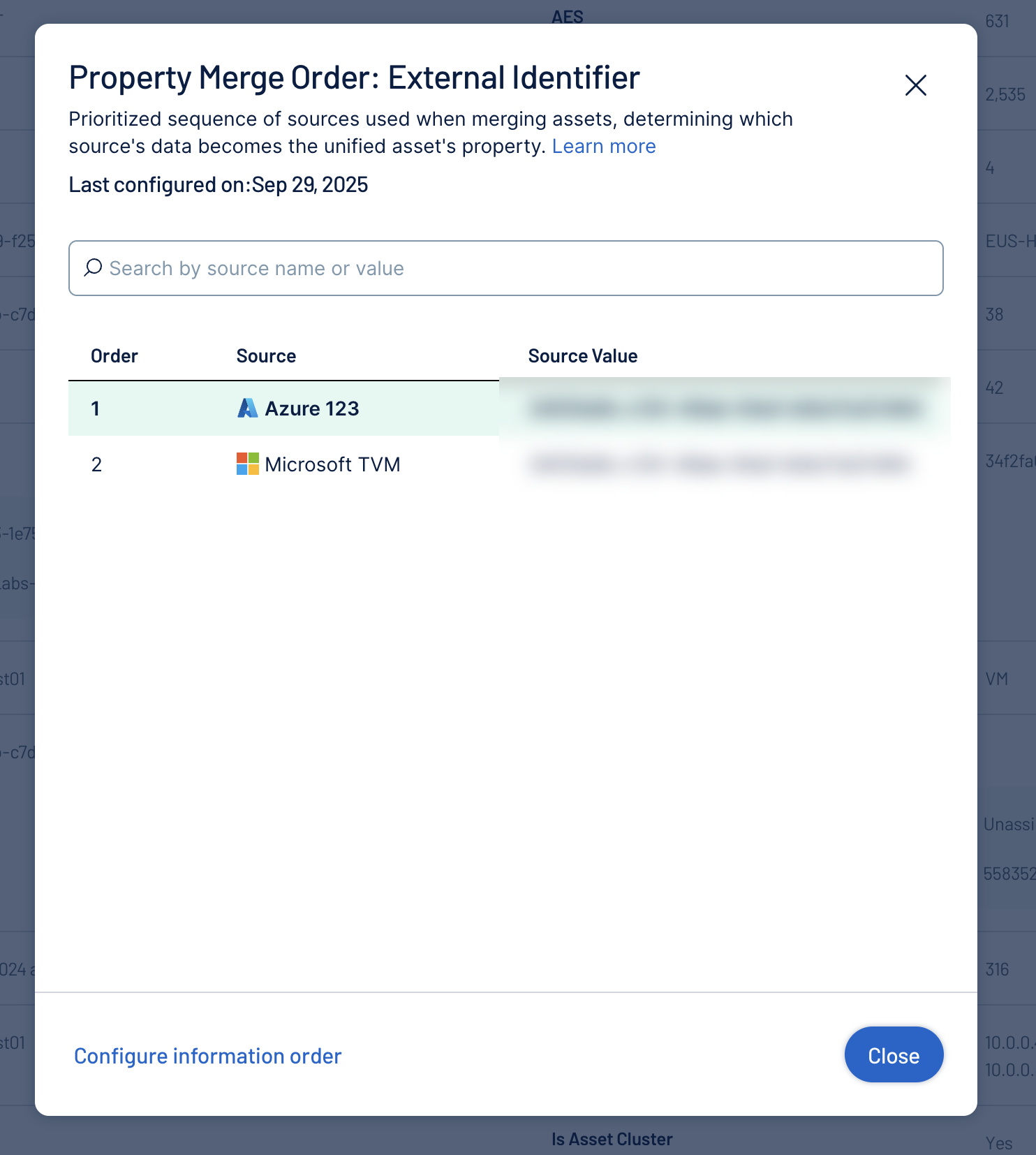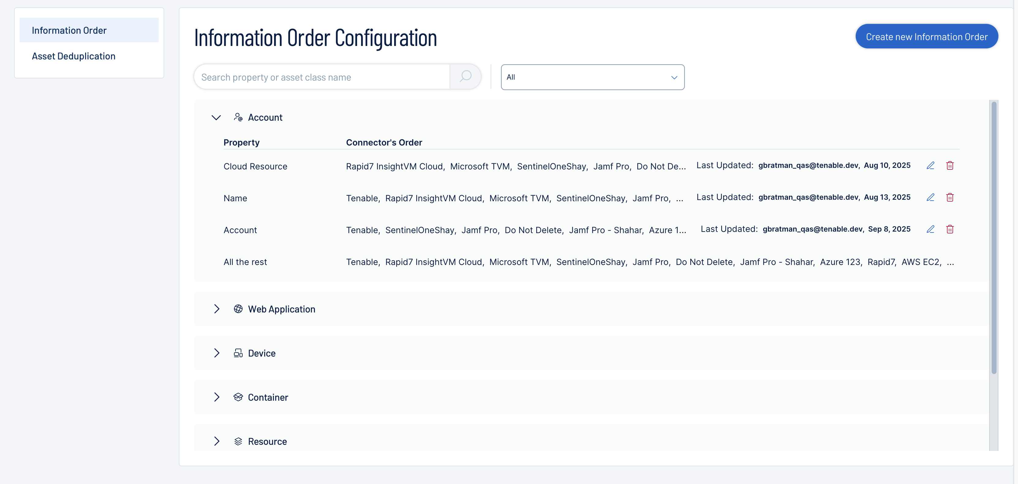 Users now have the capability to customize the default information order for each asset class. This gives control over which connector’s data is prioritized when displaying or calculating information in Tenable Exposure Management. This allows the user to easily manage how duplicate assets from the same source are handled across the Tenable One platform.