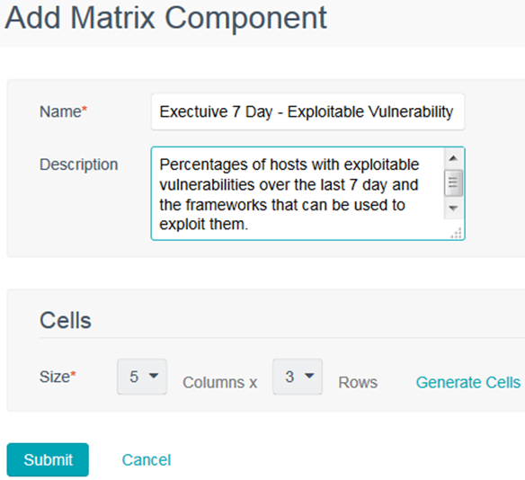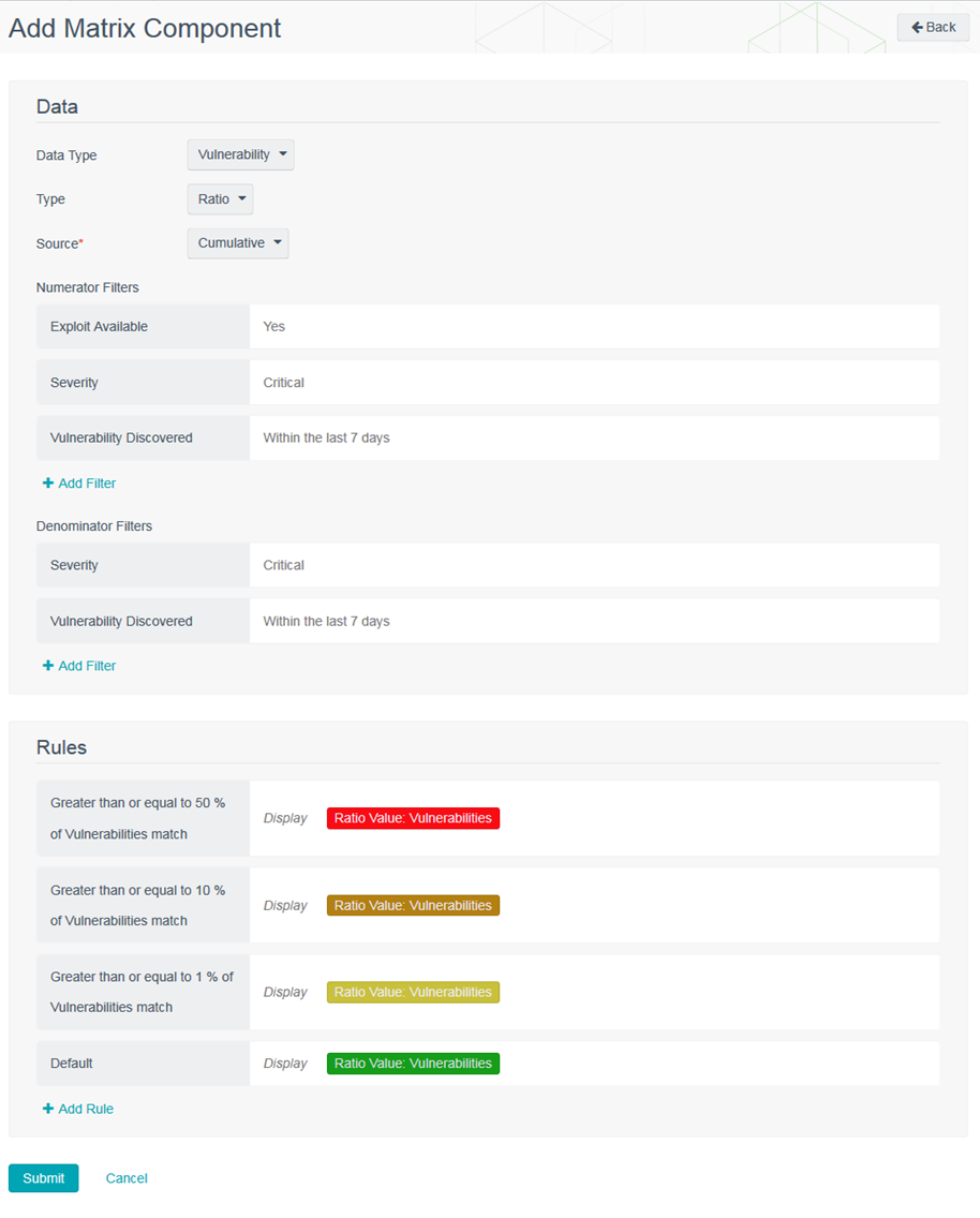 Customize the matrix component options. For example, this matrix component displays Vulnerability data by a ratio from the Cumulative database. The numerator filters are looking for vulnerabilities that have an exploit available with a Critical severity discovered within the last 7 days. The Denominator filters are for vulnerabilities that have a Critical severity discovered within the last 7 days. The rules are looking for percentages of the vulnerabilities that match and designate the ratio value with the corresponding color based on the percentages found.