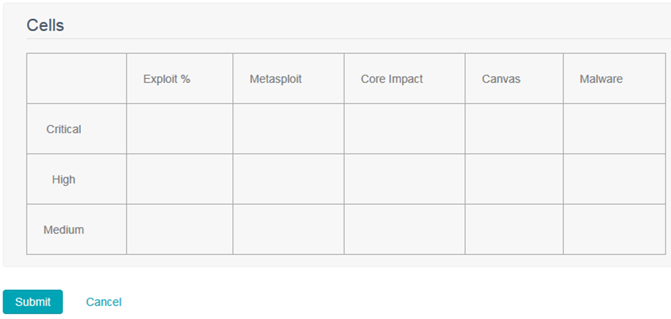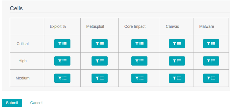 Repeat the body cell steps for the other body cells. In the example above, the other cells are similar with many of the same rules. The differences are adding a Numerator filter to include the Exploit Framework we are looking for and a Denominator filter for the Exploit Available option.