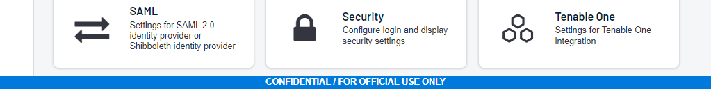 Use the SAML section to configure SAML 2.0-based SAML authentication (for example, Okta, OneLogin, Shibboleth 2.0, etc.) for Tenable Security Center users. For more information, see SAML Authentication.