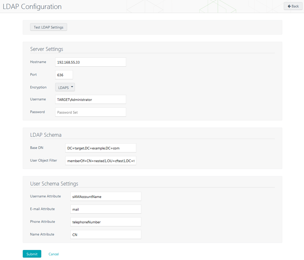 Note: Use the Distinguished Name (DN) of the new group as the Search Base (e.g., CN=Tenablesc,DC=target,DC=example,DC=com).