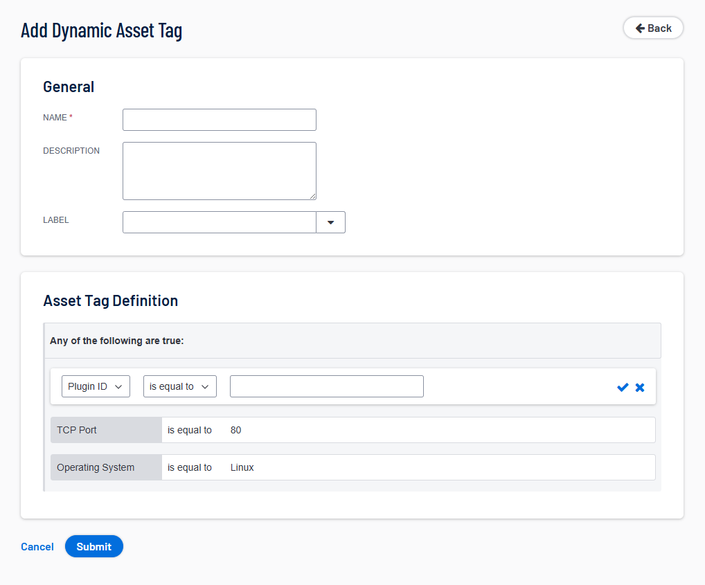| Asset Definition | Defines the rules for creating a dynamic asset tag list. Hover over an existing rule to display the options to add, edit, or delete a group or a rule. |